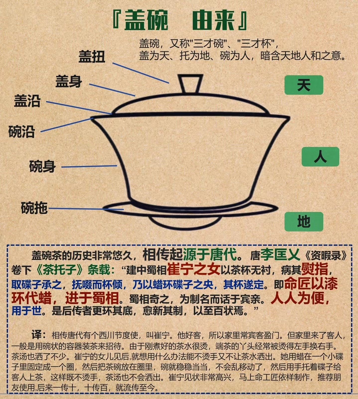 译:相传唐代有个西川节度使,叫崔宁。他好客,所以家里常宾客盈门。但家里来了客人般是用碗状的容器装茶来招待。由于刚煮好的茶水很烫,端茶的丫头经常被烫得左手换右手。茶汤也洒了不少。崔宁的女儿见后,就想用什么办法能不烫手又不让茶水洒出。她用蜡在一个小碟子里固定成一个圈,然后把茶碗放在圈里,碗就稳稳当当,不会乱移动了,然后用手托着碟子给客人上茶,这样既不烫手,茶汤也不会洒出。崔宁见状非常高兴,马上命工匠依样制作,推荐朋友使用,后来一传十,十传百,就流传至今。